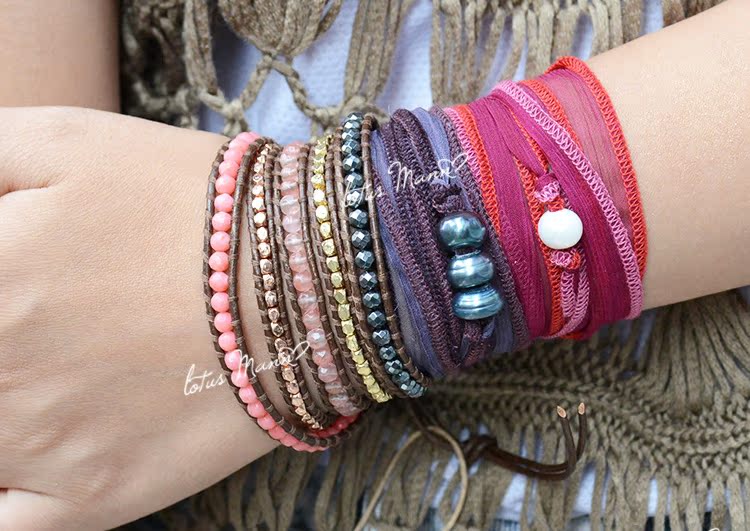 | 宝贝名称 | lotusmann 波西米亚粉色珊瑚与水晶金银珠5圈金棕色皮绳手链 |