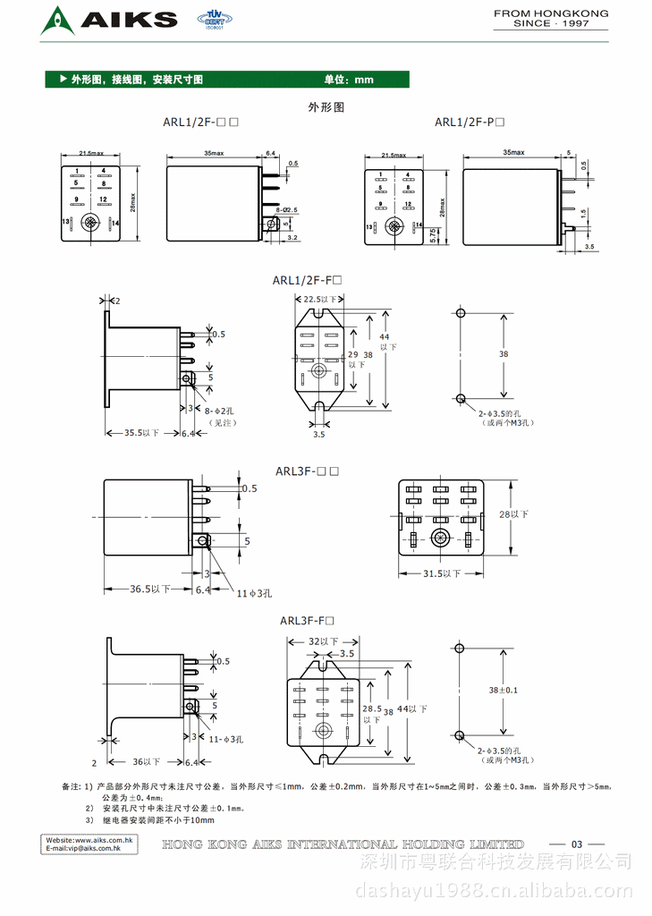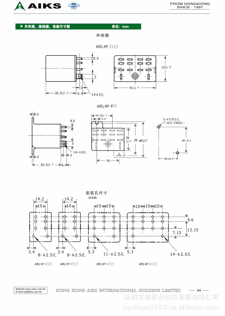 具有1、2、3、4组转换触点形式1C 15A,2C、3C 、4C 10A透明防尘罩、多种安装方式配有多种插座可供选择外形尺寸:28.0×21.5×35.0 (mm)