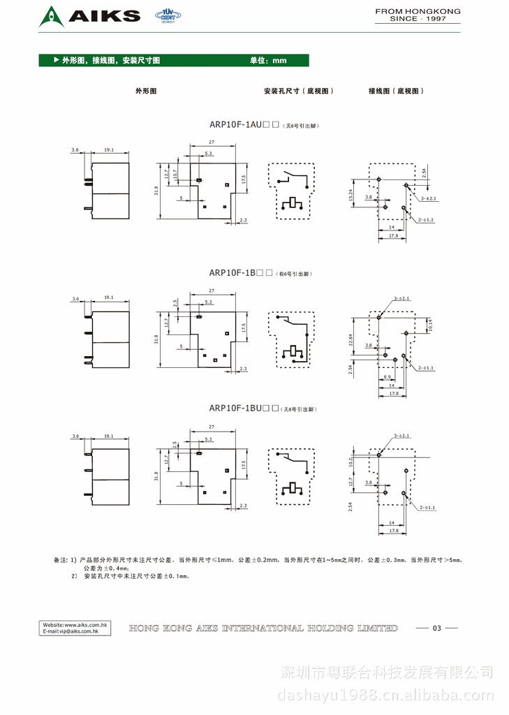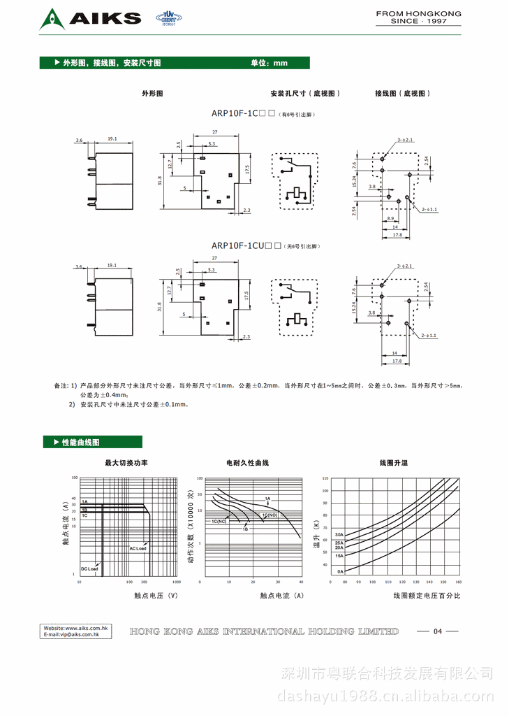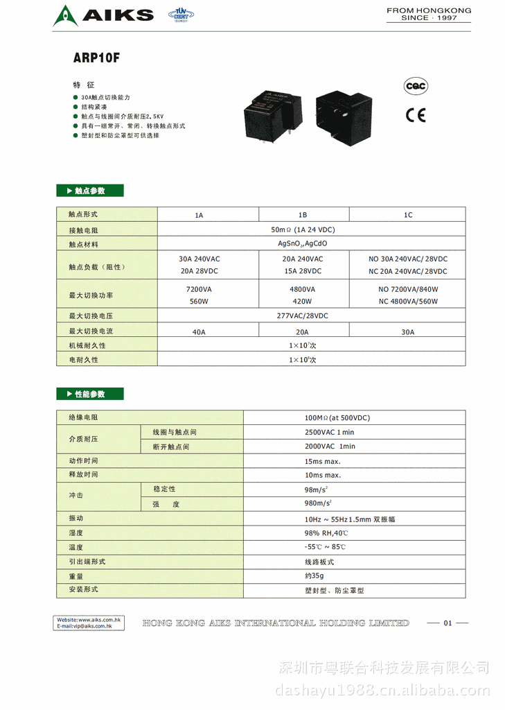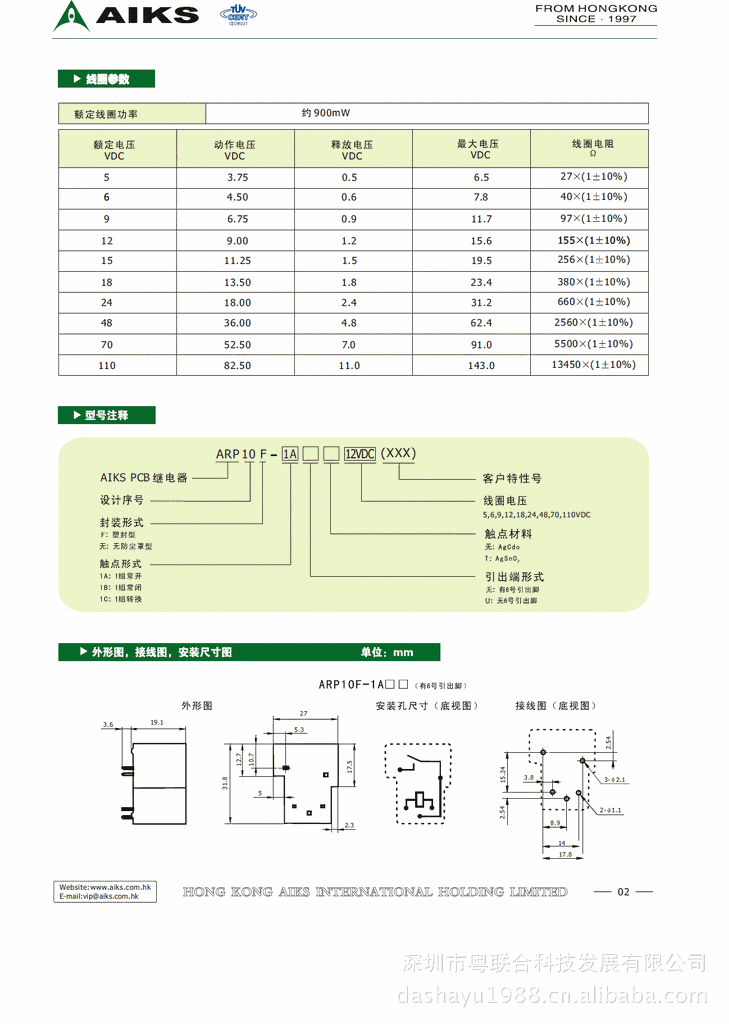 30A触点切换能力具有1组常开、1组转换触点形式触点线圈间介质耐压2.5kV敞开型和塑封型可供选择外形尺寸:32.2×27.0×20.1 (mm)