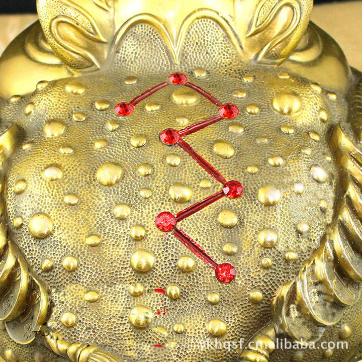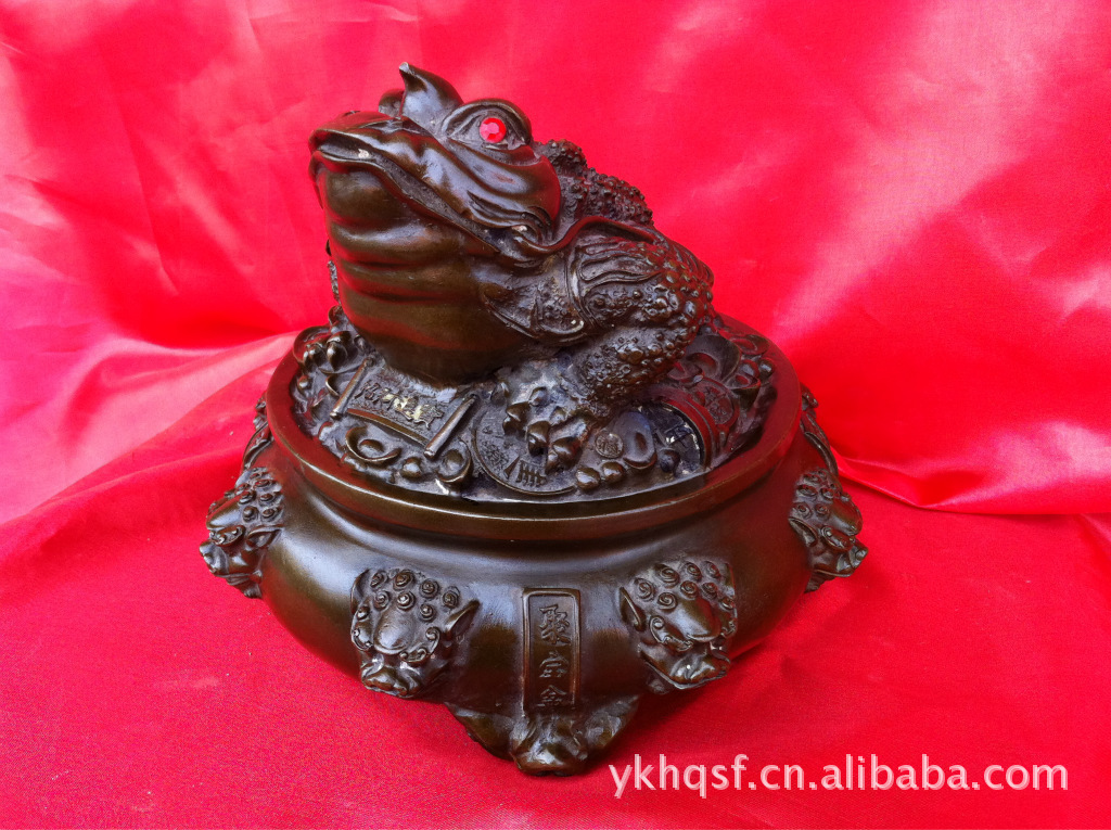 整体为一个大的金蟾。周围身上全是小的金蟾。下面为一圈12只小金蟾,吸周围的所有财气,大吃四方财运的作用,金蟾下面脚踏铜钱,起到聚财的作用。