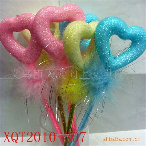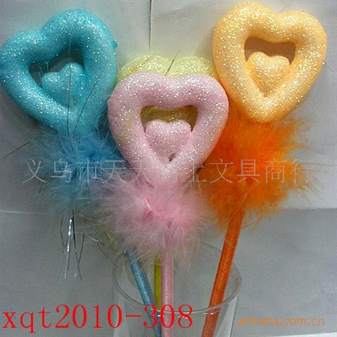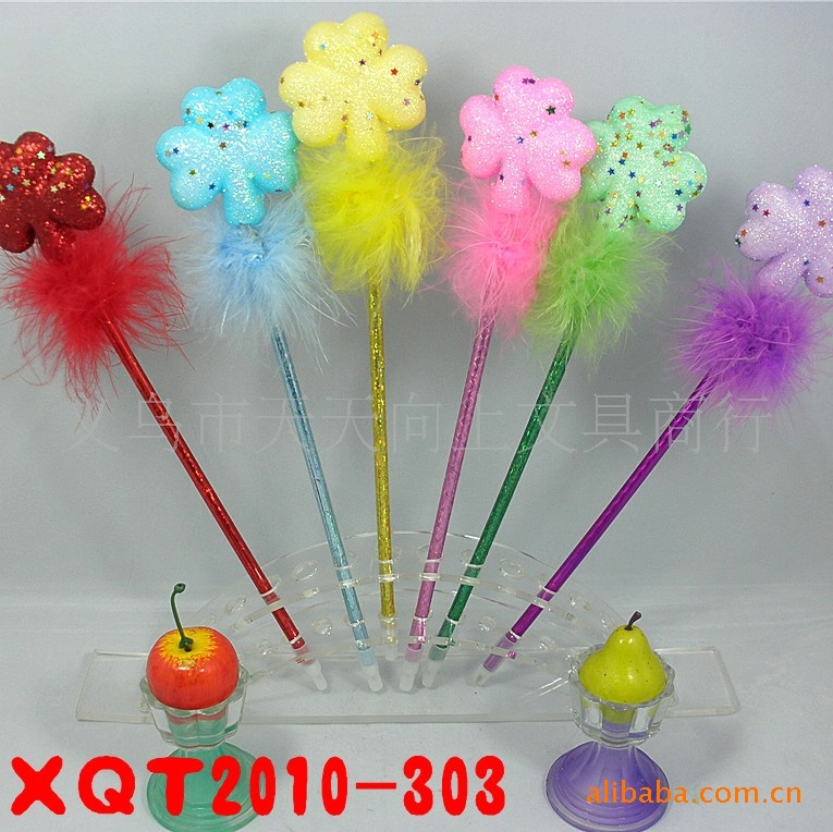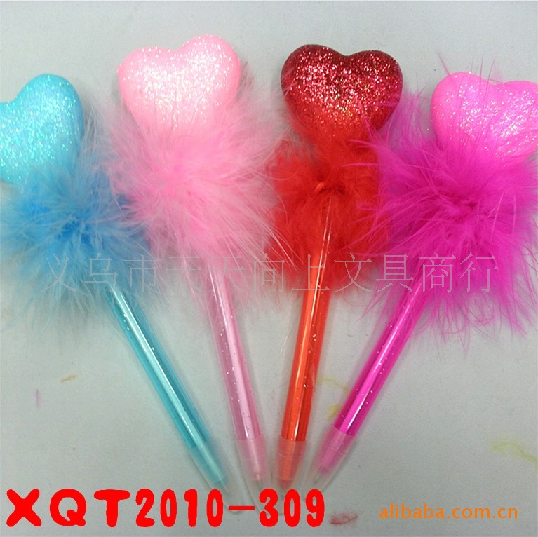 3:羽毛是经过多道工序生产而成。迎风飘扬的多色羽毛与笔杆颜色溶为一体,再搭配各种卡通造型,漂亮的花朵,爱心饰品,让整支笔充满活力。
