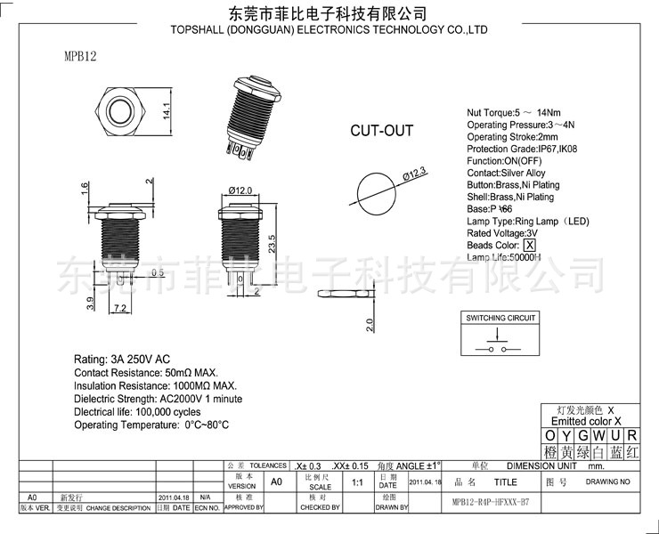 本开关属于中高端产品,采用优质的进口原金属材料经高速CNC和相关生产部门对质量的严格管控加制而成。具有IP65防水,防尘,防爆和高抗破坏之功能,产品的外型及表面精美,按键的手感很好,功能完善。其按键,灯,端子的详细分类描述如下列各项: