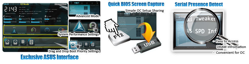 华硕主板创新功能,其首创UEFI(统一可扩充固件接口) 鼠标控制图形化操作BIOS界面,并提供两种模式供用户选择。UEFI BIOS超越传统BIOS仅能使用键盘来控制,滚动页面功能带来更有弹性且便利的输入方式。使用者可以轻松浏览 UEFI BIOS,就像在操作系统中一样。快速轻松地超频,并可利用 F12 热键 BIOS 快照功能,与其它玩家快速分享设定内容。独家的 EZ 模式会显示常用的设定信息,高级模式则适合有经验的性能玩家进行更复杂的系统控制,包括详细的 DRAM 信息。