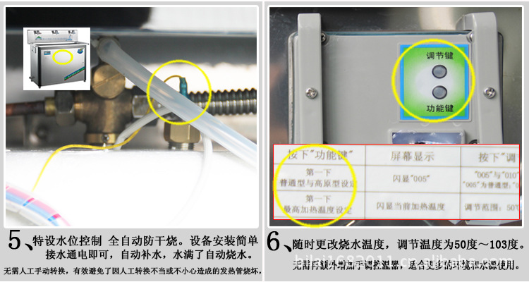 5、特设水位控制,全自动防干烧。设备安装简单,只要接水通电即可,自动补水,水满了自动烧水。无需人工手动转换,有效避免了因人工转换不当或不小心造成的发热管烧坏,真正的全自动!