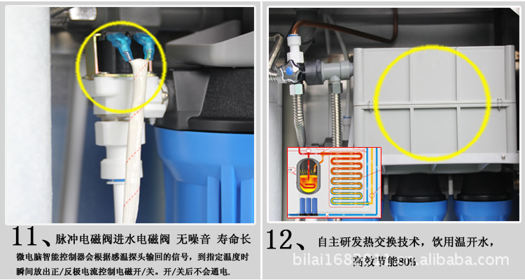 12、碧涞公司自主研发热交换技术,饮用温开水,高效节能80%。通过大管包小管,液体逆向流动,两者存在温差在管壁产生热传递!开水流到水龙头时其热能已被冷水吸走而降温到35度左右变成温开水;而冷水因吸收了开水的热能升温,进到水胆前温度在85度左右。再烧到100度只要加温15度!温开水随到随喝非常方便。