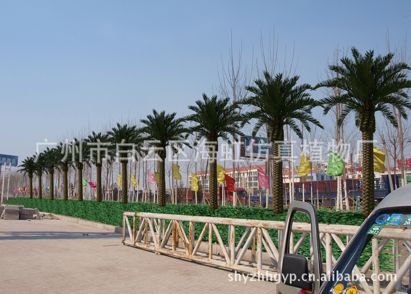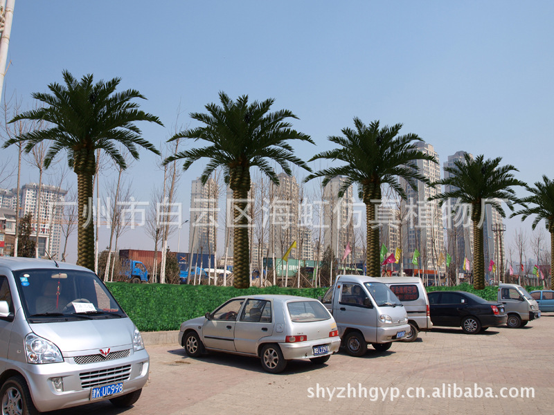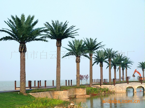 仿真海枣树:璃钢树脂树杆结构和树叶材质:采用高性能环氧树脂和玻璃纤维缠绕成型,树杆内采用国标钢结构,树叶采用ABS塑料或PU等高性能防阻燃环保材料。耐腐蚀性能良好,耐老化耐高温防阻燃,更加环保,防紫外线。