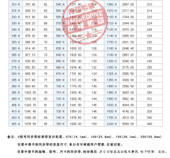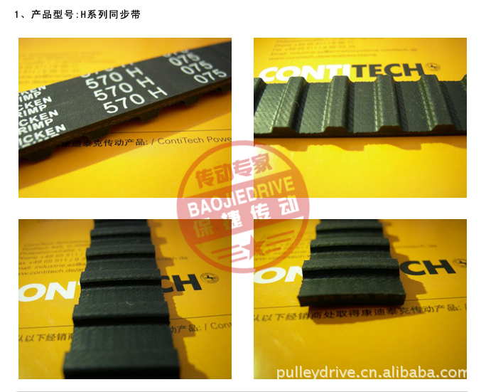 目前同步带的主要产品型号有:MXL、XXL、L、H、XH、XXH、T2.5、T5、T10、T20、AT5、AT10、AT20、STD2M、STD3M、STD5M、STD8M、STD14M、HTD3M、HTD5M、HTD8M、HTD14M、RPP3M、RPP5M、RPP8M、RPP14M、RHP3M、RHP5M、RHP8M、RHP14M等系列工业同步带与聚氨脂脂(PU)开口同步带。采用德国进口优质合成氯丁胶为主要原料,配入多种不同用途的辅料;骨架材料均为优质玻璃纤维线绳;带齿表面采用尼龙耐磨高弹力布做保护。具有动态屈绕性好,抗龟裂性能好,臭氧性能优良,耐老化,耐热,耐油,耐磨损等特点。同步带具有耐屈挠性好,伸长率低、高强力、耐热、耐寒、耐老化、耐臭氧、抗龟裂等优点,现有 同步带 30多种型号,2000多种规格,并配套 同步带轮,完全能满足客户的要求,产品性能达到并超过国际标准。