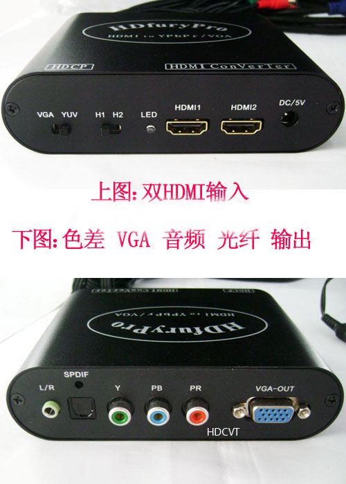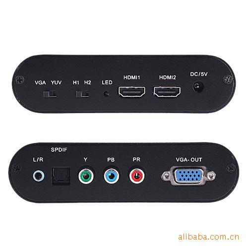 HDMI to VGA/YPBPR转换器是一款专为没有HDMI接口的电视机或投影仪而设计的,可方便实现HDMI>VGA或HDMI>YPBPR的格式变换.采用高集成度视频芯片处理,可将HDMI格式的高清信号转成高分辨率的VGA信号或高清晰度YPBPR信号,有助于驳接更多不带HDMI接口的显示设备(电视,投影,显示器……)