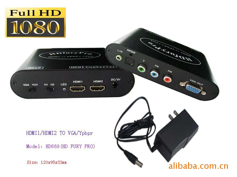 这款型号为HD-668是一款可以将高清视频HDMI数字信号转换为VGA和YPBPR模拟信号及AUDIO模拟音频和光纤数字音频信号的转换器,VGA与YPBR信号可送到CRT/LED显示器,电视机及投影机等.