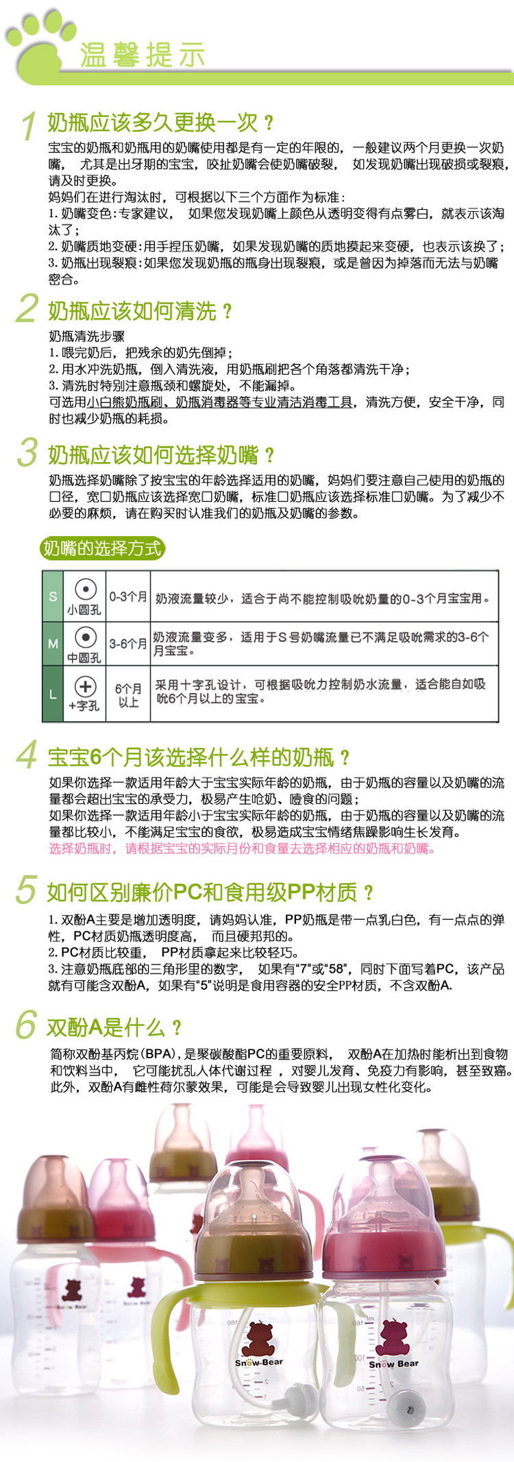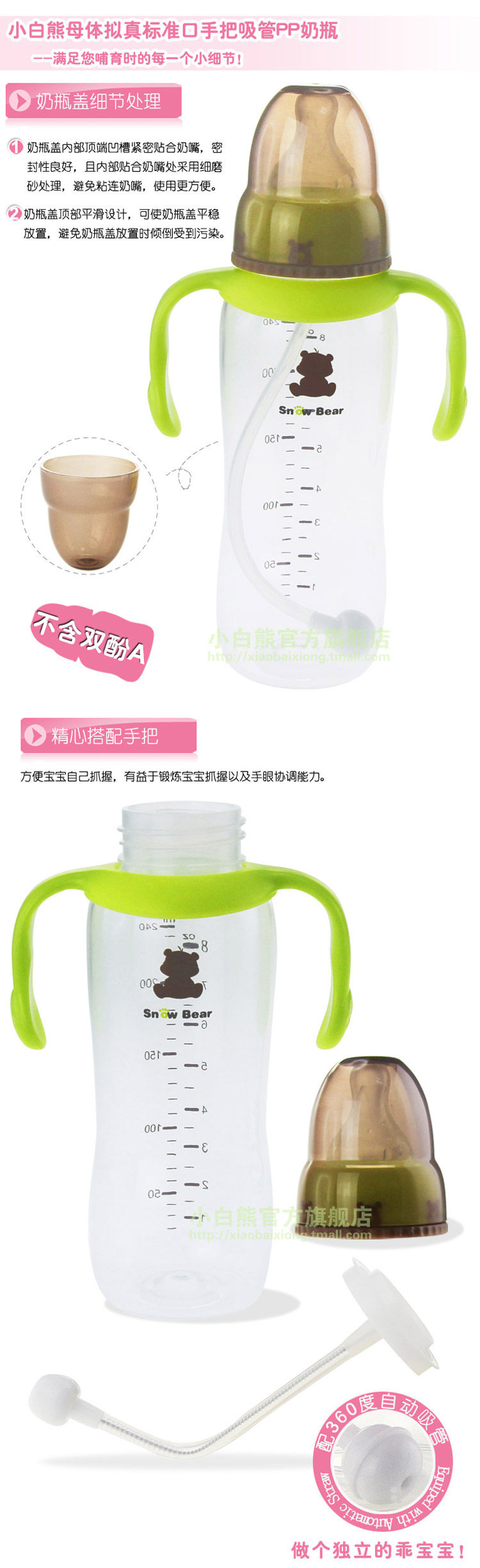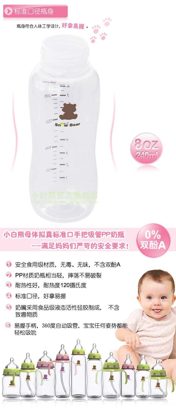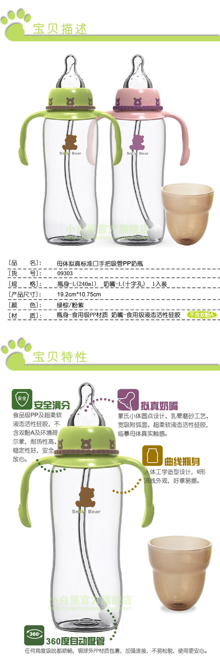 小白熊旗舰店 母体拟真标准口吸管PP奶瓶 带柄式 09303 新品
