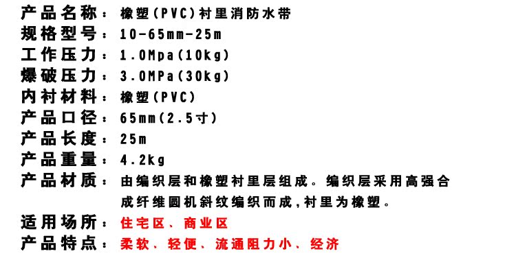 厂家直销橡塑PVC消防水带10/65/25米 船用2.5寸抗压轻便