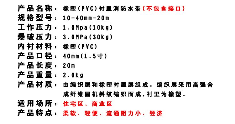 厂家直销橡塑PVC消防水带 10型40/20米1.5寸 船用农用消防车水管