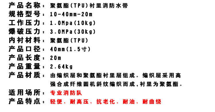 厂家直销 聚氨酯消防水带10/40/20米 船用农用1.5寸抗压耐磨水管