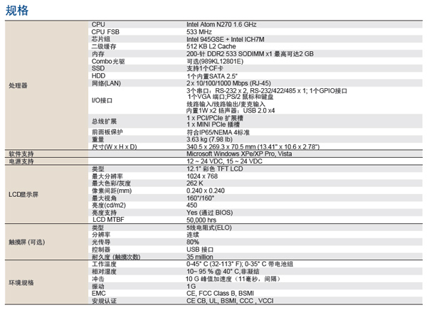 内建1.6GHZ(N270),2GBDDR2内存,3200G硬盘,12.1“TFT液晶显示屏,2*RS-232,1个RS-422/485,2*LAN,1*CF卡,6*USB 2.0接口,1*PS/2无风扇嵌入式触控平版电脑,电源适配器。