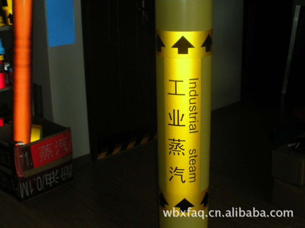 第三步:安装时,根据介质流向,将所须色环一头绕管道一周多余一点,用美工刀裁下所须色环的长度,根据管道直径的大小,剥开2-10cm左右的衬纸,将色环收紧,背胶部分粘贴在另一端上,然后将粘贴部分抹平即可,做一个色环全部过程约10秒—15秒左右。