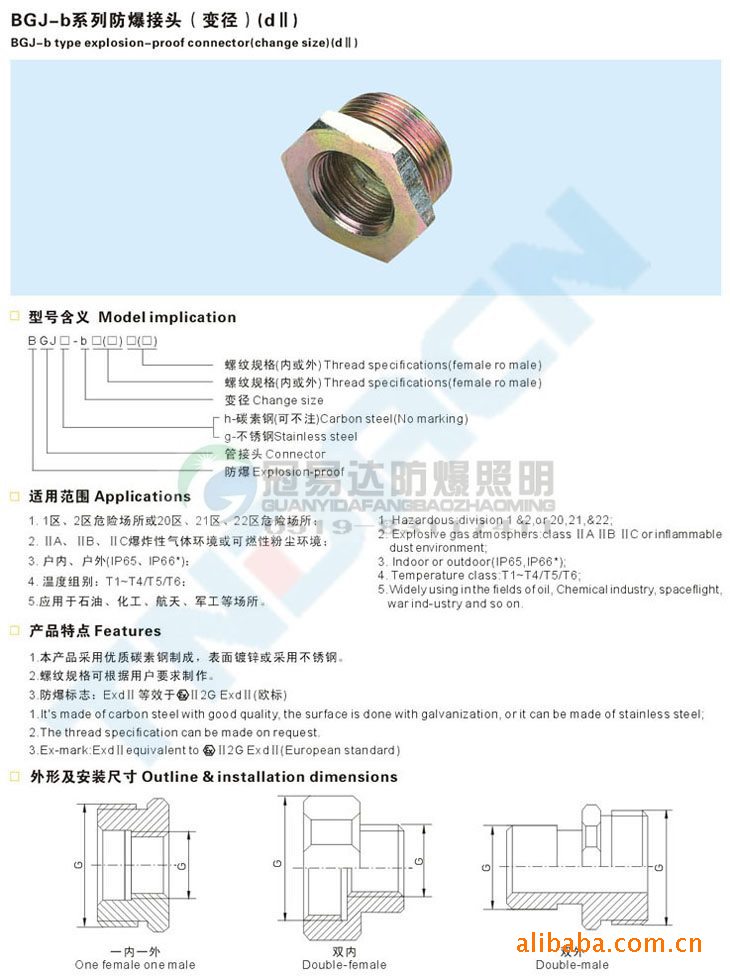 1、优质碳素钢制成,表面镀锌或采用不锈钢。 2、螺纹规格可特制,如NPT螺纹,公制螺纹等. 注:标注螺纹规格时应注明内外螺纹。 如:BHJ-G3/4(内)/G1(外)意义为一端为内螺纹G3/4,一端为外螺纹G1的碳素钢防爆活接头。 |