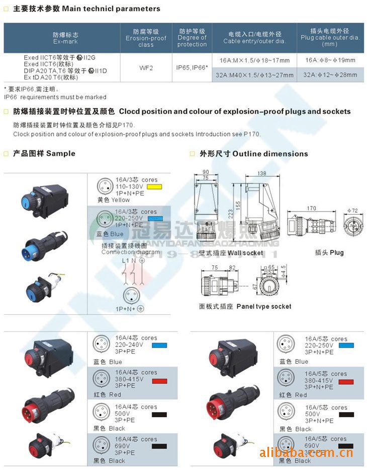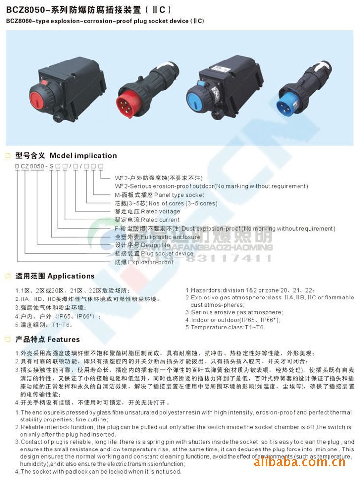 1、外壳采用玻璃纤维增强不饱和聚酯树脂压制而成,外形美观,耐腐蚀,抗静电,耐冲击及热稳定性好等优良性能。2、具有联锁结构。只有插座内的开关分断后方能拔出插头。3、内装开关为防爆元件。4、钢管或电缆布线均可。