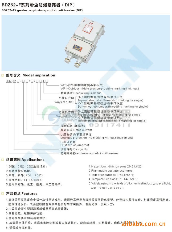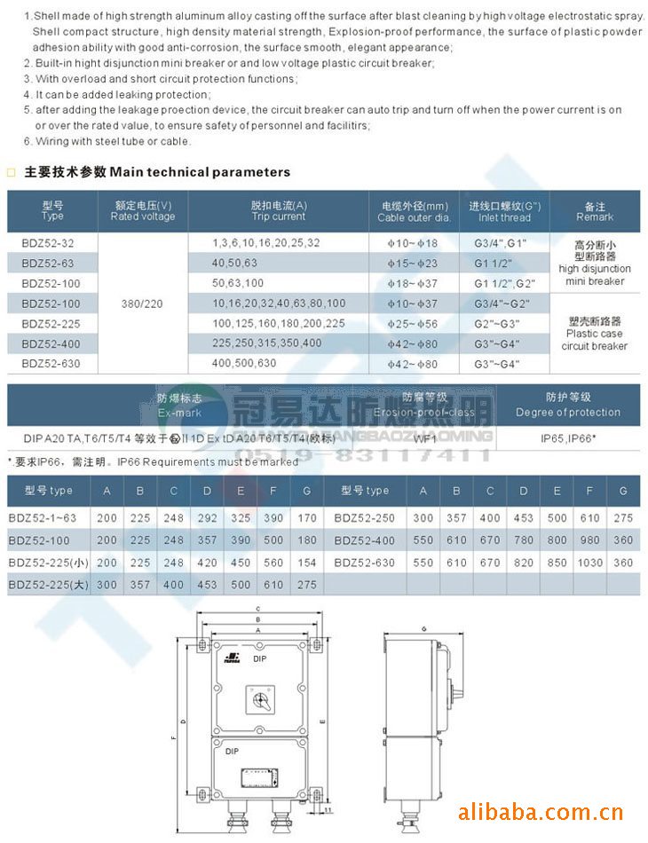 适用范围:爆炸性气体混合物危险场所:1区、2区爆炸性气体混合物:ⅡA、ⅡB、ⅡC 温度组别:T1~T6 防爆标志:dⅡBT6、dIICT6 防护等级:IP54*IP65 进线口螺纹:G1 1/4〃~G2 1/2〃外壳材质:铸铝合金