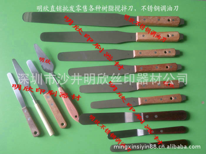 供应STAINLESS STEEL各种规格的调油刀.调墨铲.刮墨刀.进口不锈钢材料制作,韧性好,产品经久耐用,调油刀手柄为轻木制握把,让调色操作更得心应手,欢迎咨询选购。