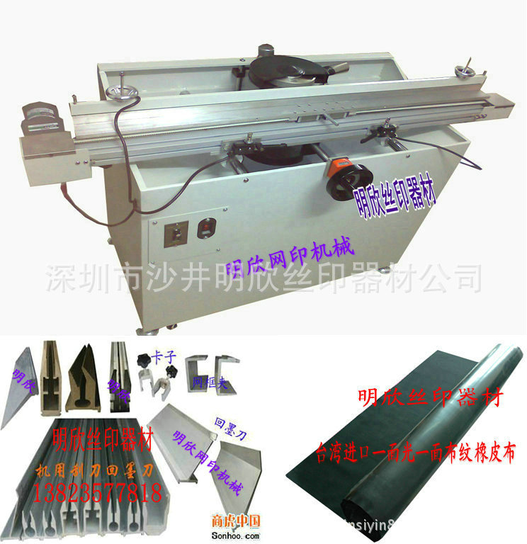 公司专业提供:各个厂家丝印机刮刀回墨刀、刮刀卡子、方通、网框夹、五星把手、丝印机、晒版机、拉网机、烘版机、烘道线UV光固机、油墨搅拌机、磨刮刀机、三辊研磨机、电晕机、烫画机、菲林柜、吸气手印机、手印台、覆膜机、调油刀、铲刀、除尘除静电胶辊、静电刷、网版张力计、刮胶硬度计、晒版机橡皮布、密封条、晒版机真空泵、快门马达、反光罩、晒版机锁扣、散热风扇、刮胶剪刀、牛皮胶布、银龙胶纸、网框、南宝树脂粘网胶、104固化剂、丝印网纱、台板胶、潘通色卡、进口感光胶、护网夜、红色补边剂、蓝封、脱脂剂、磨网膏、鬼影膏、783开油水、718洗网水、、UV光油、晒版灯、UV灯、变压器、触发器、电容、风机、铺带机、高压水枪、高压清洗冲版机、电动喷枪、冲版枪、冲版台、钉枪、枪钉、砂带机、上浆器刮斗、菲林笔、清洁沾湿台、手动打浆机、拉网头、拉网钳、蝴蝶夹、T型铁把手、马仔、印花导轨、铝刮柄,进口刮胶、手刮刀、脱模粉、滚动裁纸刀、卡尺、测厚仪、对色箱等,可为客户设计定做大型晒版机、大型手动丝印机台,粘接特大幅面晒版机橡皮布,经济适用,并可修理各个厂家丝印机、UV机、晒版机;更多详情请来电垂询。