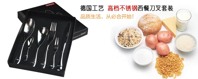 | 基本信息 | | 【产品名称】 | 必合不锈钢刀叉凯撒六件套BHTKS06 | | 【产品材质】 | 医用级18/10不锈钢 | | 【产品尺寸】 | 多规格尺寸,详情见下 | | 【产品重量】 | 多规格重量,详情见下,总重:0.407kg | | 【产品特点】 | 足量用料,坚实坚固,不易变形或磨损。 造型遵循人体工程学原理,把握舒适更顺手。 外观靓丽,工艺精良,彰显生活品味 | | 【注意事项】 | 为使产品日久常新,请勿用钢丝刷等锐利、硬质器具刮洗。 为使产品经久耐用,请勿用坚硬物体敲打、撞击手柄。 | | 【产品数量】 | 6个/套(含餐刀 餐叉 餐匙 汤匙 二齿果叉 咖啡匙) |