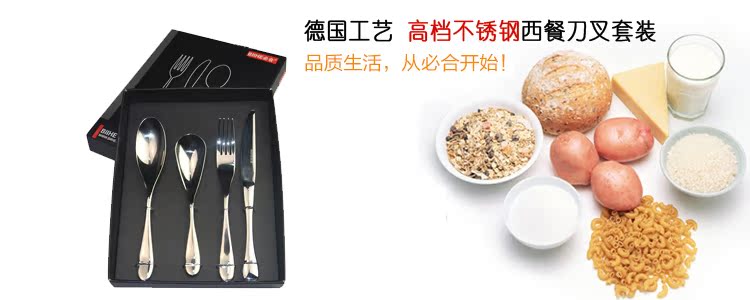 | 基本信息 | | 【产品名称】 | 必合不锈钢刀叉凯撒四件套BHTKS04 | | 【产品材质】 | 医用级18/10不锈钢 | | 【产品尺寸】 | 多规格尺寸,详情见下 | | 【产品重量】 | 多规格重量,详情见下,总重:0.364kg | | 【产品特点】 | 足量用料,坚实坚固,不易变形或磨损。 造型遵循人体工程学原理,把握舒适更顺手。 外观靓丽,工艺良精,彰显生活品味 | | 【注意事项】 | 为使产品日久常新,请勿用钢丝刷等锐利、硬质器具刮洗。 为使产品经久耐用,请勿用坚硬物体敲打、撞击手柄。 | | 【产品数量】 | 4个/套(含餐刀 餐叉 餐匙 汤匙) |