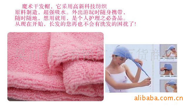 洗发沐浴后,湿漉漉的长发粘在头上多难受!特别是晚上,女士们湿湿的长发干得更慢,甚至把衣服抖弄湿了,很容易引起着凉感冒和头痛。想把头发马上弄干,又担心过多的使用电吹风,会损伤头发发质。但是想马虎少洗几次吧,头发又怎会顺柔滑爽,健康亮丽呢,还容易产生讨厌的头屑,让人特别尴尬。怎么办呢?试试这款特别为长发的您准备的神奇的干发浴帽吧,它采用高新科技纺织原料制造,超强吸水。当您疲惫不堪,洗完澡就想睡觉时,便可以戴上它马上入睡;外出游玩时随身携带,随时随地,想用就用,是个人护理之必备品。