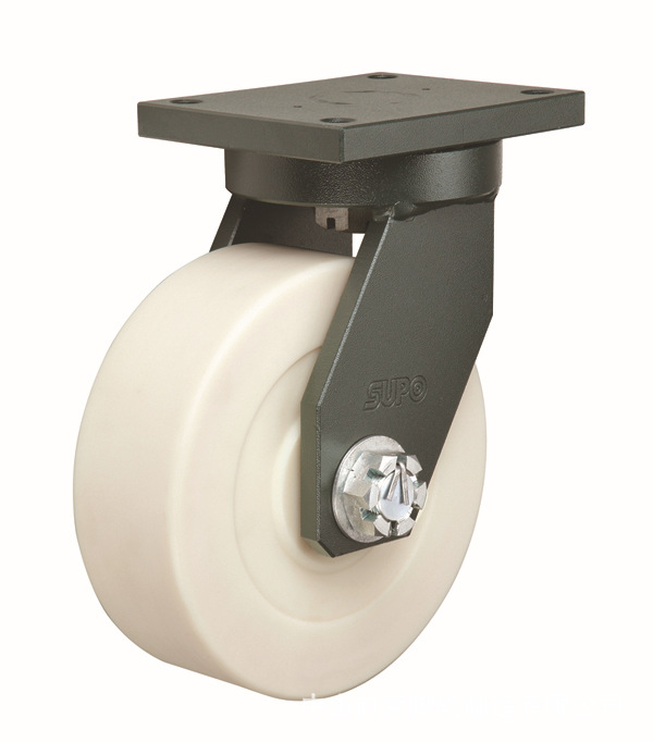 支架:超厚钢板焊接结构结合平面轴承,更耐重、转动灵活,更具有稳定性;橡胶防尘圈,防水,防尘,延长平面轴承使用寿命;烤漆的表面处理,更大的提升了抗腐蚀能力,寿命更有保证。轮子:采用德国进口高强度尼龙材料,灌注成型,坚硬耐磨、耐高低温,抗老化等功能;稳重的平面单轮面结构以及铬钢双滚术锥面精密轴承,超大轮宽,更具有转动灵活,超大载重量和稳定性。范围:适合于机械制造,汽车行业,造船,机场物流等超重负荷中低速运输(2-8KM/H)。使用温度-35~80℃。