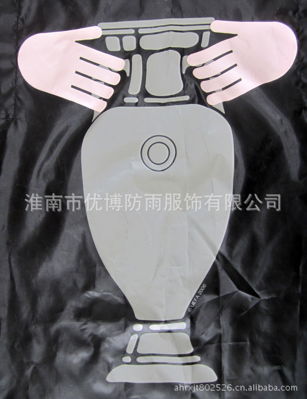 该款式为2012年欧洲足球赛专用雨衣,使用高档防雨面料,内层为AC胶涂层,前片带口袋,前后印制欧洲杯LOGO标志,不变形不褪色,是理想的户外休闲雨衣。