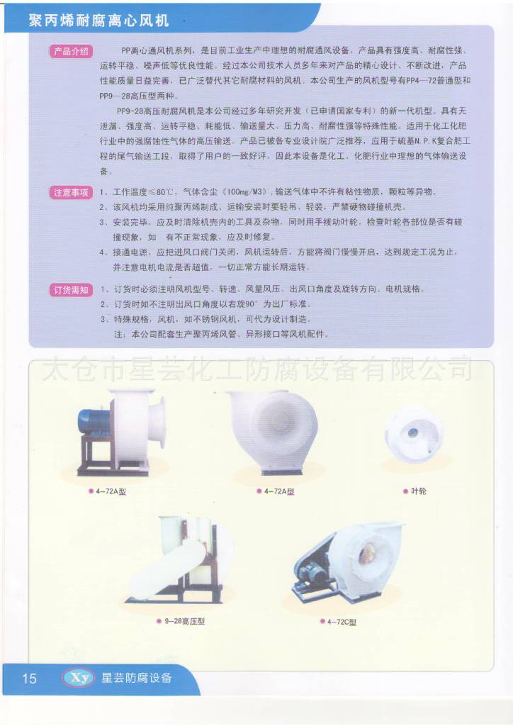 PP离心通风机系列,是目前工业生产中心理想的耐腐通风设备,产品具有强度高、耐腐性强、运转平稳、噪声低等优良性能。经过本公司技术人员多年对产品的精心设计、不断改进,性能质量日益完善,已广泛替代其它耐腐材料的风机。本公司生产的风机型号有pp4-72普通型和pp9-28高压型两种。