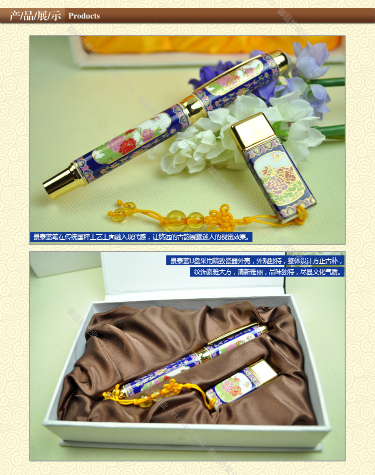 景泰蓝陶瓷笔U盘,真瓷笔,景泰蓝会议礼品套装