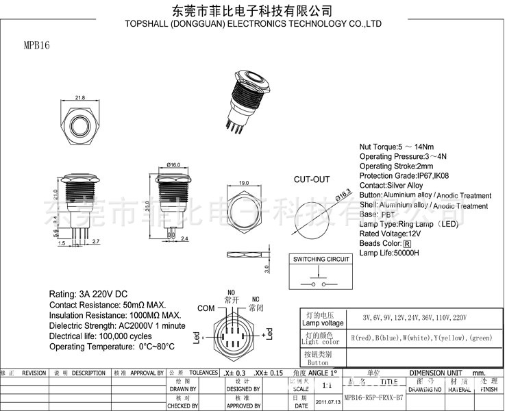 本开关属于中高端产品,采用优质的进口原金属材料经高速CNC和相关生产部门对质量的严格管控加制而成。具有IP67防水,防尘,防爆和高抗破坏之功能,产品的外型及表面精美,按键的手感很好,功能完善。其按键,灯,端子的详细分类描述如下列各项: