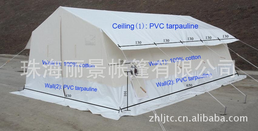 本产品采用铝合金或镀锌管做帐篷支架,帆布或pvc布料做罩子,帐篷配备防蚊窗户、防风拉绳,可以抵御10级以上的大风,安装快捷,收起来不占地方,特别适合户外作业,救灾安置,本公司曾多次参与联合国和红十字会的订单加工,产品质量保证,咨询电话:13825613869 赵先生 QQ554948108