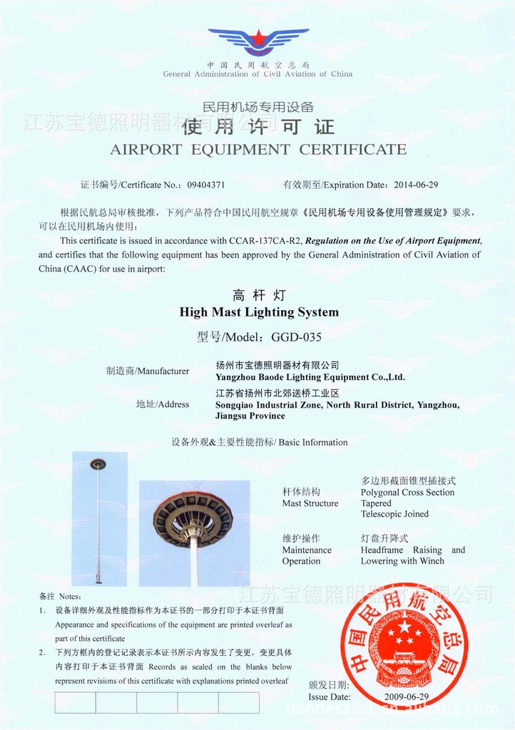 多年来,公司连续被评为“重合同守信用企业”、“AAA级资信企业”、 “执行标准优秀企业” 、 “质量管理优秀企业”,荣获《扬州市知名商标证书》、《江苏省名牌产品证书》、《太阳能路灯高新技术产品认定证书》顺利通过了ISO9001:2000质量管理体系认证、ISO14001:2004环境管理体系认证、产品通过了“CCC”认证和“CQC”认证、国家民航总局颁发的《机场照明高杆灯使用许可证》,同时具有《安全生产许可证》和《道路照明工程一级施工资质》、《输变电钢管结构产品检验合格证书》、《广播通讯铁塔及桅杆产品生产合格证书》及《交通信号灯合格证书》等。