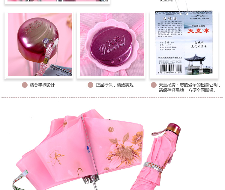 产品特点:最便宜的天堂牌雨伞之一,钢骨结构很结实,不防紫外线,伞面二片印花,其它几片清纯一色,简约大方,实惠好选择!