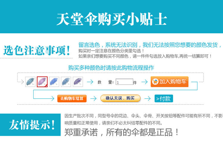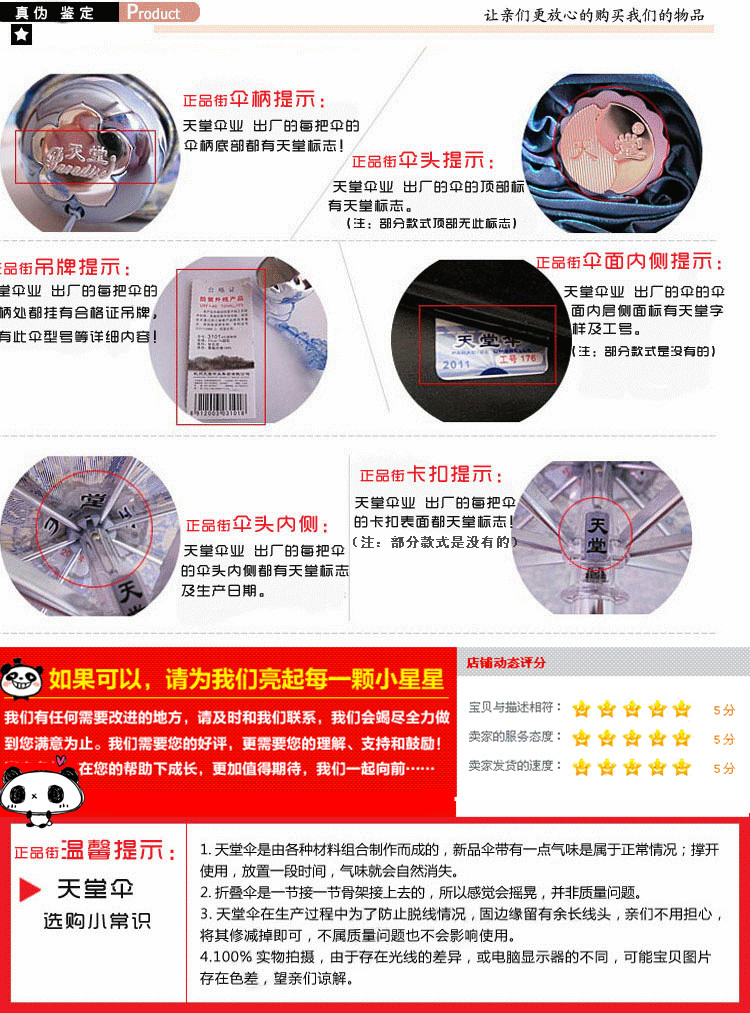 缺点:五折伞节数较多,所以开合要紧些,没有三折伞收合方便,伞形也没有三折伞好看,节数多,坏的机率要相对高点,只是相对而言哦,天堂的五折伞质量已经很不错了。