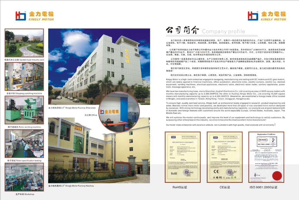 我公司是集微型电机和微型减速箱的研发,生产,销售于一体,目前国内唯一一家同时规模化生产微电机和减速箱的现代化高新技术企业。产品分两大类:微型减速电机/微型电机共一百多个品种。产品广泛用于金融机械、办公自动化、电子门锁、电动窗帘、电动玩具、医疗器械、自动贩卖机、游艺设备、广告设备、安防器材、舞台灯光、自动理牌机、家用电器、电子阀门/水表、卫浴电器、电动工具、按摩器材等。 微电机产量达:600万台/月,在台湾,香港,上海,天津,广州,杭州,宁波,深圳等地设有直属销售分公司