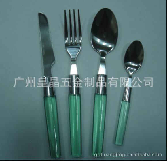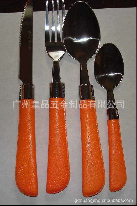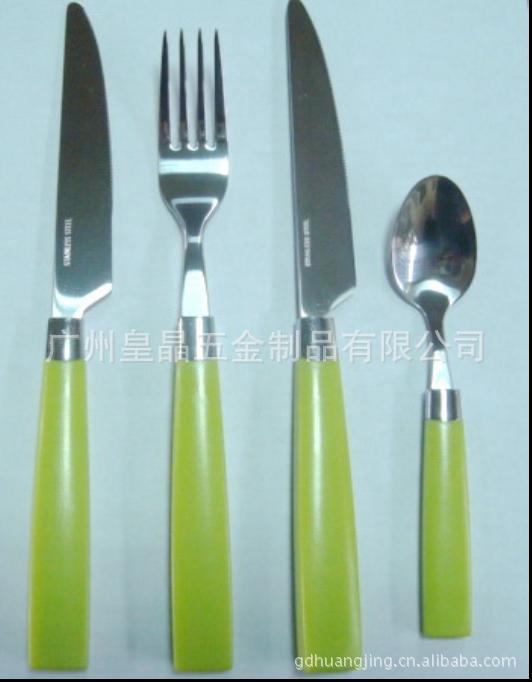 不锈钢塑料柄餐具厂家 便携环保塑料柄餐具 韩国勺叉三件套批发