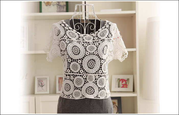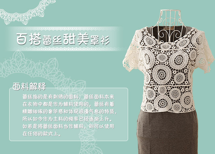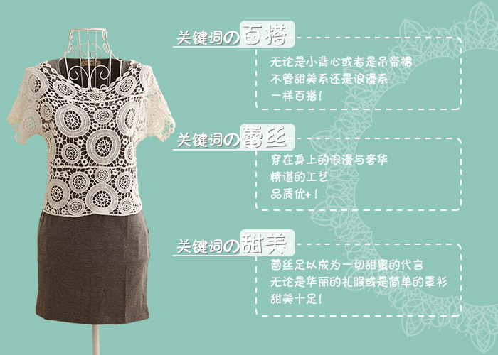 个性百搭,无论是小背心还是吊带裙,都一样百搭。整体蕾丝钩花,甜美十足。做工精细,适当的拼接更显层次。