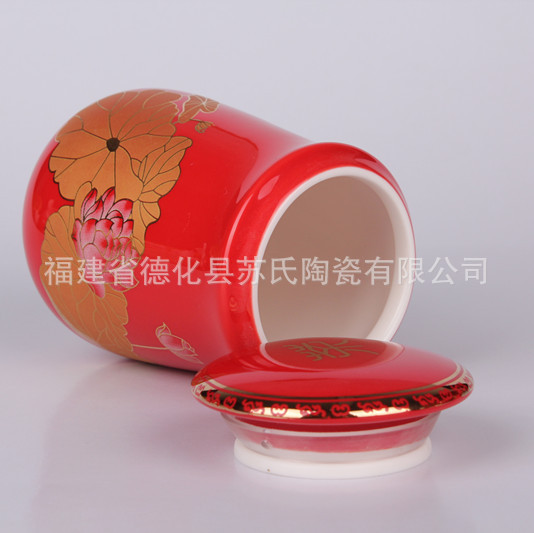 | 材质 | 高白瓷 | 品名 | 红釉金荷腰型罐 |
