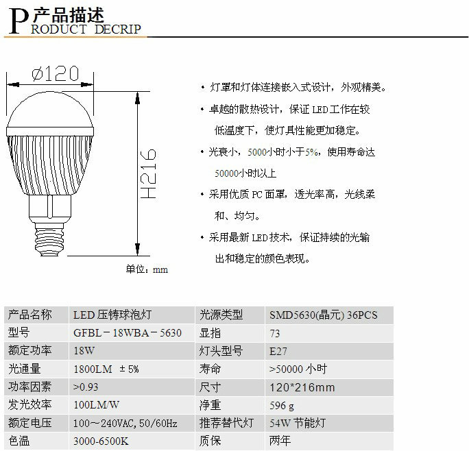 供应其他GFBL-18WBA-5630压铸球泡灯 18wled球泡灯