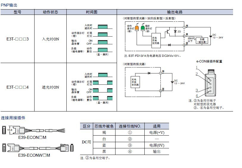 通用微型·放大器内置可实现1m的长距离检测。 ■按用途选择有4种类型:透过型/扩散反射型/限定 E3T-FD11反射型/回归反射型。■φ0.8mm的微小光束(E3T-SL1□)能进行微小工件检测。■采用单片光电IC (集成电极)可信度高。■装载OMRON公司独有的FAO本机器是世界上最早采用同轴回归反射型的机型。