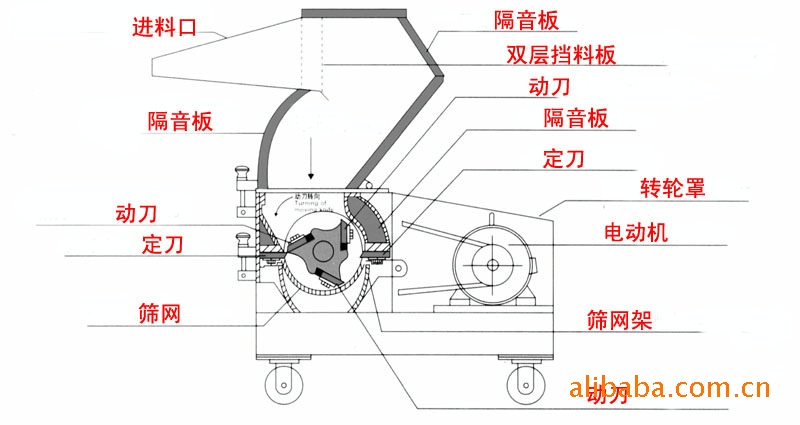 2、 针对薄膜料破碎而独特设计的剪刀型刀架结构,更加有利提高工作效率,可选配吸料风机、储料桶组成薄膜破碎回收系统可更加充分发挥回收效率。