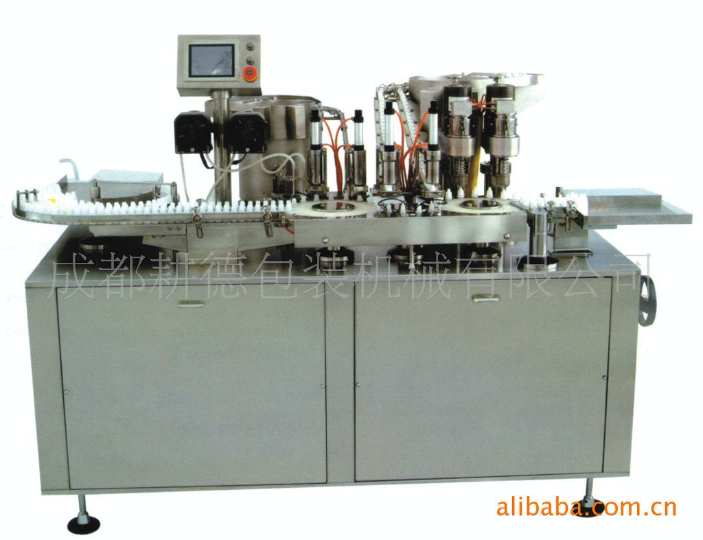 Brief Introduction:This machine is mainly available to fill eye-drop into various round plastic or glass bottles with the range from 5--20ml.High precision com provides a regular plate to position, cork and cap; accelerating cam makes capping heads go up and down ;constant turning arm screws caps; creepage pump measures filling volume; and touch screen controls all action. No bottle makes no filling and no capping. If there is no plug in the bottle, it must not cap until having detected plug in the bottle. The machine enjoys high position accuracy, stable driving, precise dosage, and simple operation and also protects bottle caps.We have developed some advanced cap placing ways, as fetch cap by vacuum, or manipulator through cooperating with foreign engineers, the machine reached international advance level.