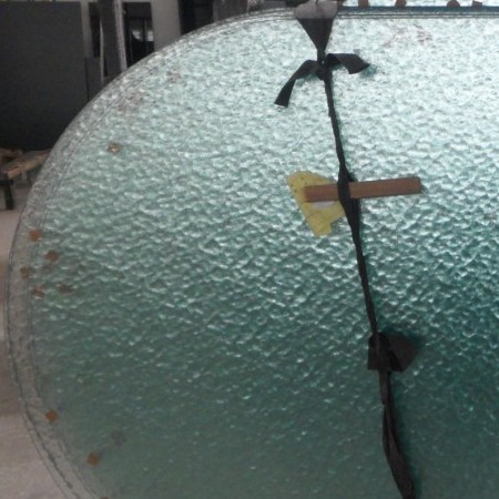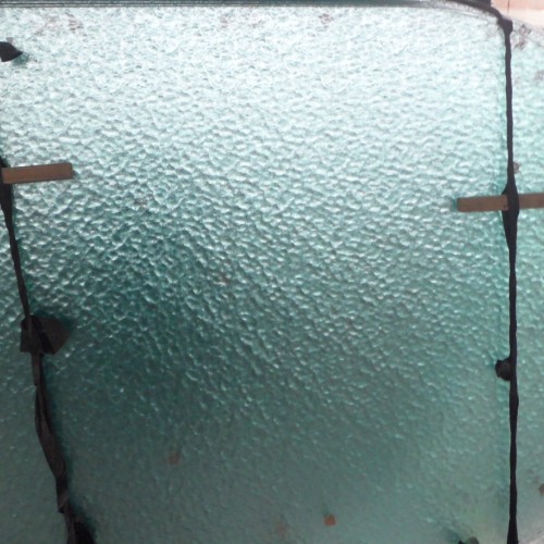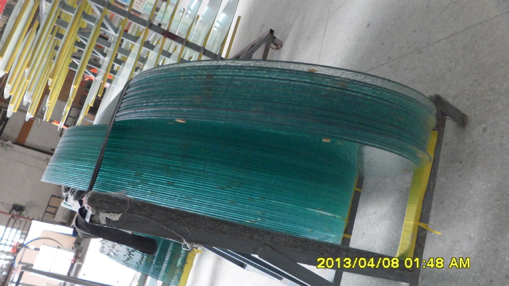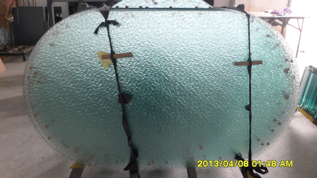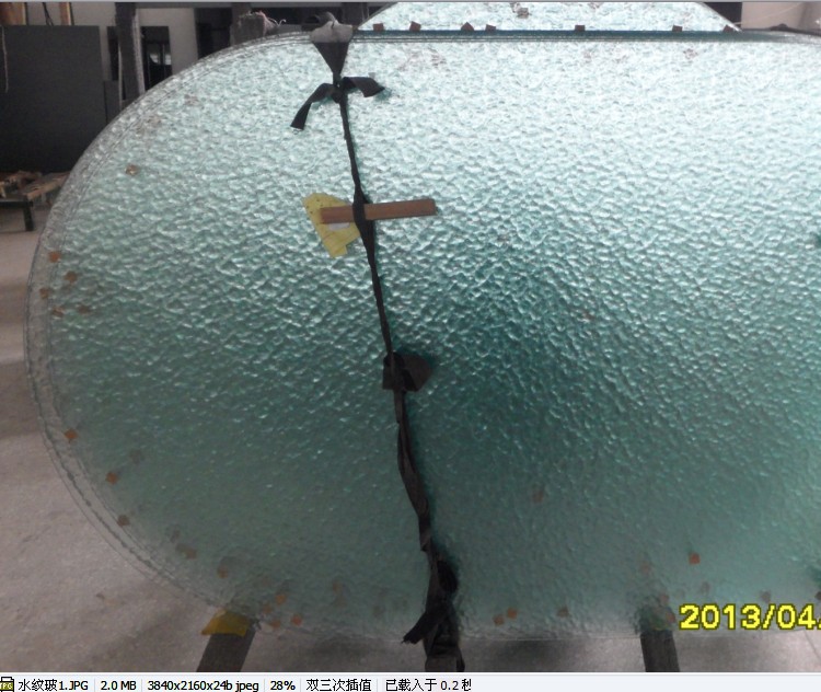 水纹玻璃,压花玻璃的一种,厚度5毫米,水波纹,可进行各种加工,如磨边、钢化、打砂、喷漆、车花、钻孔等等。此款玻璃是经过磨直边钢化加工的,两头为双圆头,规格是1742*1030*5。如图