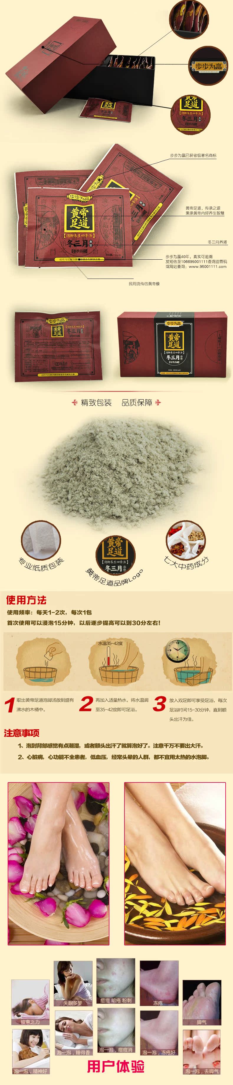 黄帝足道泡脚养生四季汤由纯中药制剂而成,无任何添加,对皮肤无任何刺激,养生崇尚四季泡脚,综合运用四季调神大论的原理,四季养生,各季分明。更是由于每一包都是按照人体的元素需要调配而成,因此用药更加准确、科学。每晚泡脚,能够有效改善浑身无力、头晕眼花的症状,还能增强体质,使人精神振奋。坚持用黄帝足道泡脚养生四季汤泡脚能够进一步改善慢性病症状、改善疲劳,改善睡眠的功效;针对糖尿病、恶性肿瘤、精神异常、慢性阻塞性肺部疾病也有一定的改善效果,能够减轻疼痛,疏通血液经络,加快新陈代谢,使废物及时排出体外,对慢性病的治疗起到一定的辅助作用。