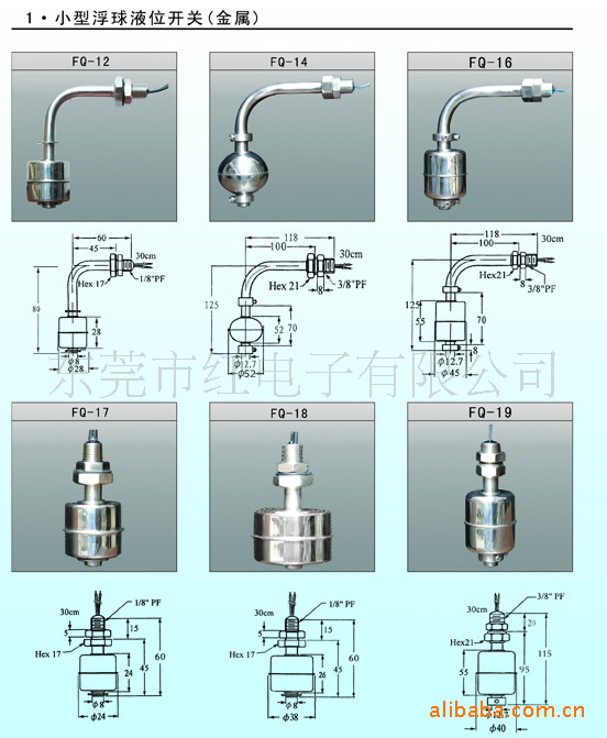 三.浮球开关的量法及订货需知:1.从外六角平面到浮球开关的最底部测量尺寸为开关总长度,2.然后测量2卡簧中间的距离以及浮球尺寸,如多个浮球,应测量浮球与浮球之间的距离。3.测量杆子直径和螺纹型号。4.根据接线方式和控制水位的需要应标明出线几根、线长长度、线材材质、浮球动作点(就是浮球位置通断)及安装方式、所需要的电压电流、触电形式常开还是常闭、温度范围等等。