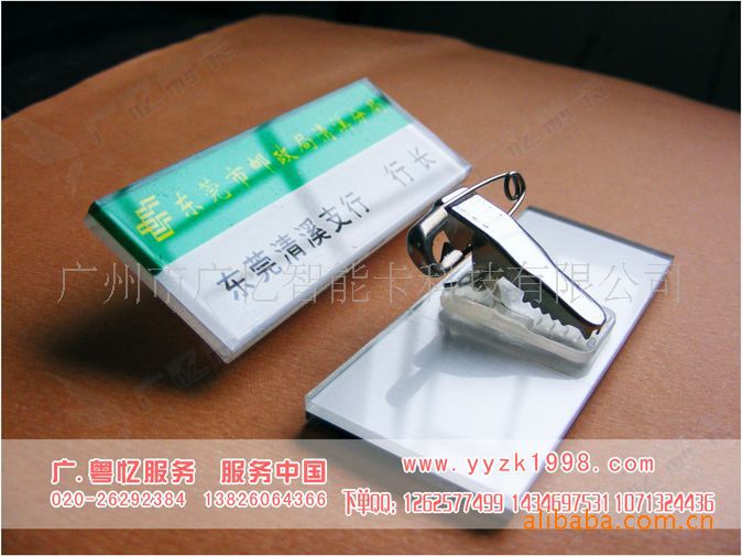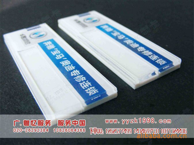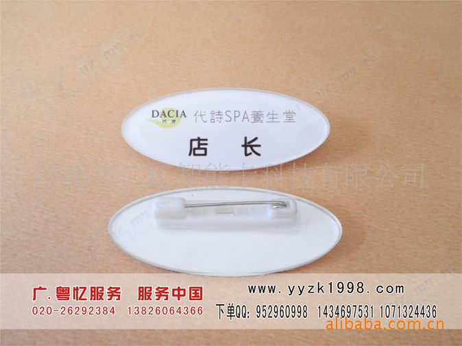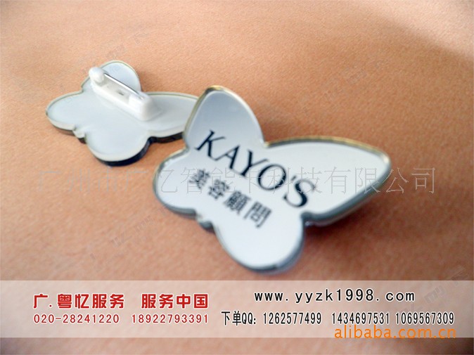 广州出货速度最快胸牌厂家{粤忆是您最佳的战略合作伙伴} 专业设计制作各种高档精美胸卡胸牌,主要生产印制产品有亚克力胸牌制作、有机胸牌制作、水晶胸牌制作、滴胶胸牌制作、滴塑胸牌制作、水晶徽章制作、学校校牌制作、校徽制作、印制学生校卡、金属胸牌制作、金属工号牌制作、铝合金胸牌制作、不锈钢工号牌制作、金属胸卡制作、金属工牌制作、专卖店店员牌制作、笑脸牌制作、微笑牌制作、水晶滴塑胸牌制作、有机丝印胸牌制作、员工工牌制作、工厂厂牌制作、销售员工号牌制作、店员工号牌制作、水晶胸徽制作、金属徽章制作、PVC工牌制作、PVC工卡制作、酒店工号牌制作、工牌制作、异形胸牌制作、不规则形状胸牌制作、特殊形状工牌制作、挖槽胸牌制作、可更换式胸牌制作、开槽胸牌制作、插纸胸牌订制、服务员胸牌制作、房地产公司高档胸牌制作、免滴塑胸牌制作、金属滴胶胸牌制作、俱乐部胸牌制作、KTV员工胸牌制作、娱乐城工号牌制作、美容院存包牌制作、寄存牌制作、钥匙牌制作、酒吧吧员牌制作等。款式精美,品种齐全,精美高档,质优价惠,欢迎来电咨询! 员工胸号牌设计制作是一种别于胸前,用来展示企业形象和体现企业文化和表示员工身份的专用标识牌。我们工厂拥有高精度的胸牌胸卡制造设备、高技术高素质的操机师傅,我们用细心、信心和专心将制作出来的高质量胸牌成为您企业形象和文化展示中不可缺少的一部分,将您的企业形象和文化展示得更加好。 {材质}亚克力、金属、PVC、水晶、滴胶、有机玻璃、 尺寸}常用尺寸20*60mm 22*65mm 20*70mm 25*70mm 可以根据客户所设计好的尺寸形状来订做。任意形状、任意尺寸、任意颜色均可订做,质量防水、防晒。 金牌品质 粤忆打造,专业、专注、专心 下单QQ:1262577499 24小时客户服务热线:13826064366 全国最快胸牌生产商、广州粤忆胸牌厂家、做最专业的胸牌厂