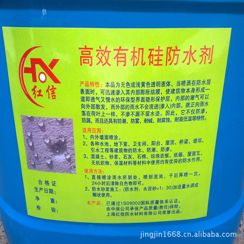4.喷涂抗渗漏施工:有机硅防水剂加4倍清水稀释后喷涂于水泥面、砖、瓦、石膏板、普通涂料墙等吸水性无机建材表面用于抗渗防潮处理,具有优良的效果。
