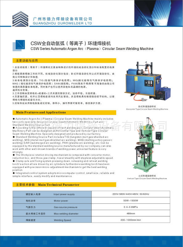 注:规格参数如有变更,以本公司最新产品为准。自动氩弧环缝焊接专用设备自动氩弧环缝焊接专机一般分为卧式和立式环缝焊,主要用于圆筒对接环缝、圆筒封口环缝焊。焊接材料多用于不锈钢、铁、黄铜、钛等。如石油化工容器,管道法兰、汽车消音器等。我公司生产的环缝焊专机采用无极旋转导电方式,避免焊接电缆来回反复造成损伤,也避免因其辎重对旋转阻滞而影响焊接的稳定性,焊接速度为0.2-0.6upm,根据客户的焊接工件及工艺设计工装夹具,可配置送丝机构进行自动填充焊丝,焊接电源应选配有收弧、起弧功能和脉冲功能的氩弧焊机。